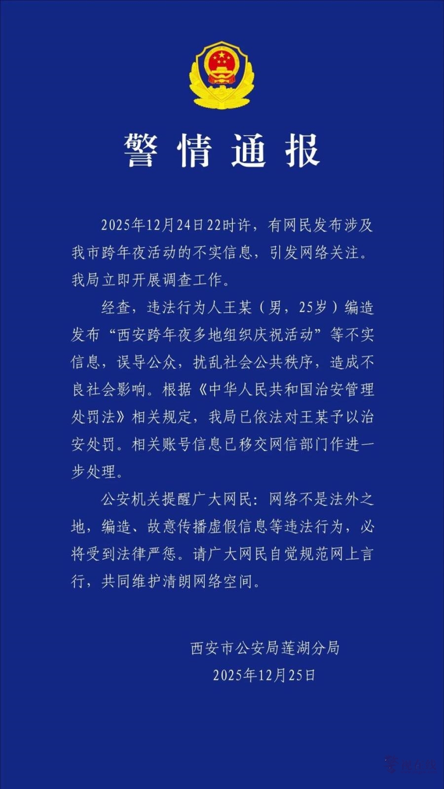 西安市公安局莲湖分局12月25日下午发布警情通报称,2025年12月24日22时许,有网民发布涉及我市跨年夜活动的不实信息,引发网络关注。该局立即开展调查工作。经查,违法行为人王某(男,25岁) 编造发布“西安跨年夜多地组织庆祝活动”等不实信息,误导公众,扰乱社会公共秩序,造成…
