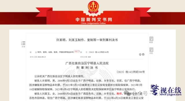 广西壮族自治区宁明县人民法院刑事判决书(2023)桂1422刑初388号公诉机关广西壮族自治区宁明县人民检察院。被告人许某明,男,2000年9月2日出生于广西宁明县,壮族,大专文化,农民,住广西宁明县。因涉嫌贩卖淫秽物品牟利罪,于2022年5月19日被黑龙江垦区公安局宝泉岭分…
