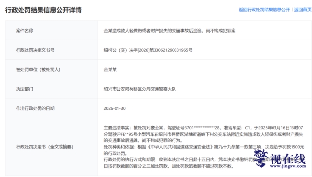 政事儿近日,“金晨涉嫌交通肇事‘顶包’事件”有新进展。浙江政务服务网公开了行政处罚决定书。行政处罚决定书称,金某造成致人轻微伤或者财产损失的交通事故后逃逸,尚不构成犯罪案。主要违法事实:被处罚对象金某,驾驶证号3701************28,准驾车型:C1,于2025年…