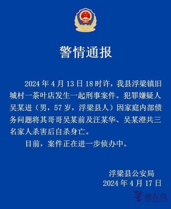 浮梁县公安局4月17日通报:2024年4月13日18时许,我县浮梁镇旧城村一茶叶店发生一起刑事案件。犯罪嫌疑人吴某进(男,57岁,浮梁县人)因家庭内部债务问题将其哥哥吴某前及汪某华、吴某澄共三名家人杀害后自杀身亡。目前,案件正在进一步侦办中。
