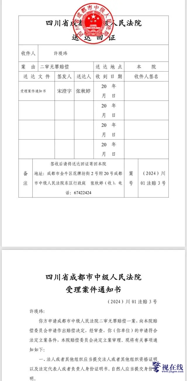 10月26日,澎湃新闻(www.thepaper.cn)从樊玥聪处获悉,他与许琰玮于10月12日向成都市中级人民法院提交了《国家赔偿申请书》。10月24日,许琰玮收到该院出具的《受理案件通知书》。通知称,许琰玮的申请符合法定立案条件,成都中院赔偿委员会决定立案审理。不过,樊玥聪称其目前尚未收到该通知。